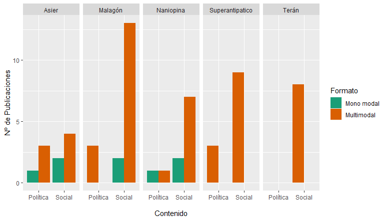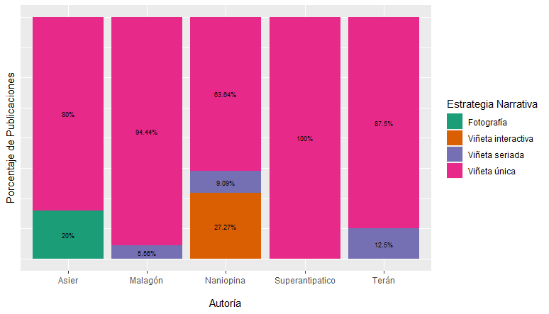 Los cinco ilustradores prefirieron, por un lado, abordar las temáticas sociales durante el período analizado por sobre el contenido político. Estas publicaciones fueron en su mayoría de carácter multimodal, es decir, atendieron la clasificación de Lakoff y Johnson (1980). De igual manera permitieron comprender la metáfora de la viñeta (su sentido) gracias a la multimodalidad (Kress y Van Leeuwen: 2020), gracias a la comunión de los elementos visuales con los textuales. Contrariamente, el formato monomodal permitió entender la metáfora únicamente de manera visual y de forma escasa en las viñetas de Naniopina, Malagón y Asier (una referencia por cada una de ellas).