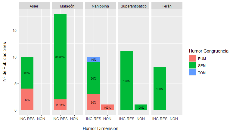 Las deducciones vertidas en el Gráfico 5 corroboran que las viñetas posibilitan con indicadores muy altos la resolución de la incongruencia (INC-RES) en todos los casos. En este sentido, se distingue que la gran mayoría de las viñetas se corresponden con la relevancia e importancia de la congruencia asociativa entre los elementos visuales basados en los aspectos semánticos del discurso (SEM), activando de esta manera el chiste o la ironía (ya sea de carácter social o político, como se registraba en el Gráfico 3).