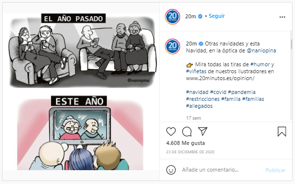 De la misma manera se comprobó que desde la cuenta Instagram del diario 20 Minutos las viñetas no restan ambiguas, ya que sus creadores no acudieron a la atribución de estados mentales (TOM) para entender el chiste o la ironía (con excepción de dos publicaciones de Naniopina).