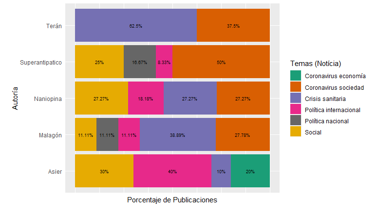 Finalmente se apreció un único tópico transversal compartido por los cinco viñetistas. Se trató de las cuestiones ligadas a la crisis sanitaria en España, aunque con un tratamiento y un nivel de profundidad diferente. Quién mejor opinó en base a estas cuestiones fue Asier (40%).