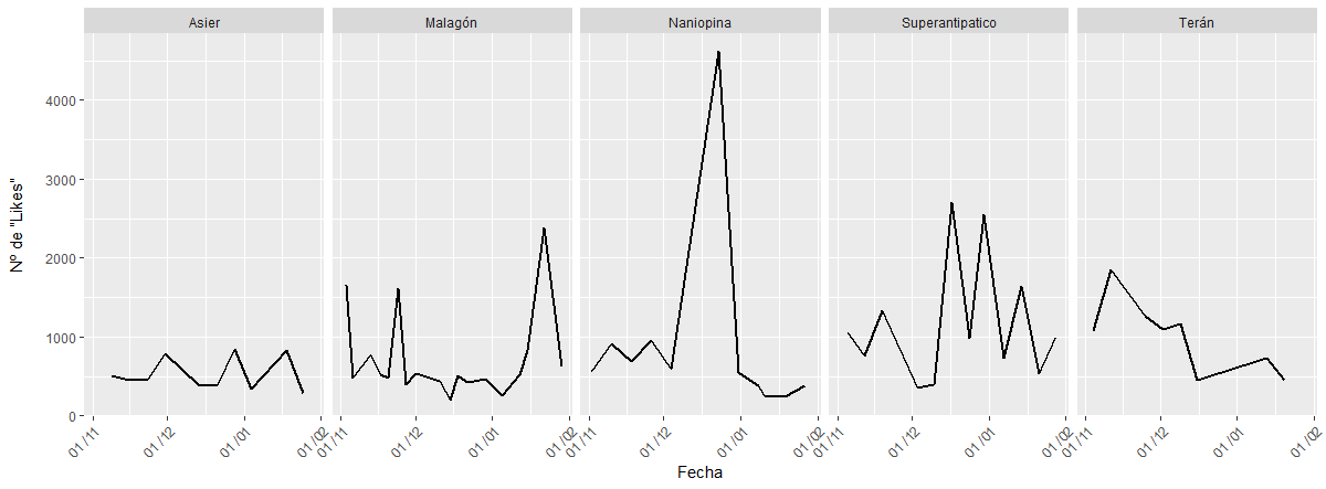 La primera de ellas sobrepasa los 4.600 ‘Me gusta’ (Naniopina) y la cuarta -con un poco más de 2.300 (Malagón)- han sido referenciadas en la Imagen 1 en el apartado cuatro.