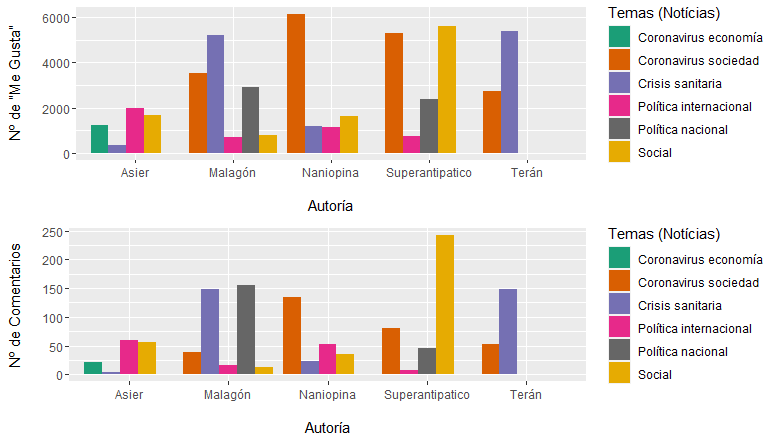 En último lugar si se hace un corte transversal de aquellas viñetas más comentadas y amadas (teniendo en cuenta los contenidos totales más interactivos en Instagram), se comprueba que tanto el trabajo de Naniopina (en lo referente a los asuntos ligado al “Coronavirus sociedad”), la producción de Superantipático (en lo relativo a los temas “Sociales”), los posts de Terán y Malagón (concernientes al contenido “Crisis sanitaria”), así como a los tópicos de “Política internacional” de Asier siguen la lógica interactiva detallada anteriormente.