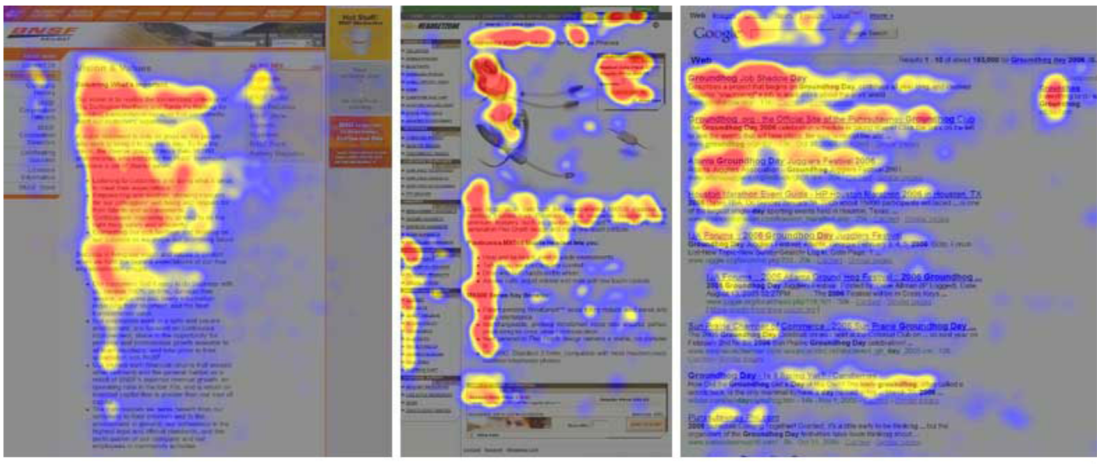 Como puede observarse en la siguiente secuencia de imágenes, el patrón ‘F’ concluye que los usuarios prestan especial atención al lead de la página y a los elementos del lado izquierdo. Es decir, “escanean de izquierda a derecha la parte superior, luego vuelven al punto de origen y escanean la parte izquierda de arriba a abajo, con algún leve escaneo de izquierda a derecha si ven algo que les interesa” (Gimeno: 2017).