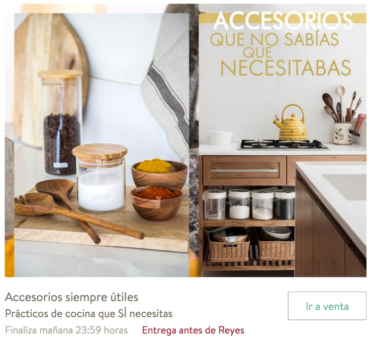 Una de las principales características de las ventas de Westwing es que solo están disponibles determinado tiempo en la web. Son promociones caducas, y los textos de las landings se encargan de dejarlo bien claro para inducir a los lectores a la acción. Todas las ventas analizadas incluyen en su portada la ‘fecha de caducidad’ de las mismas. La disposición de este aviso es siempre la misma: bajo la imagen principal aparece un texto que dice ‘Finaliza mañana a las 23.59’ o ‘Finaliza el 26.12 a las 23.59’, depende del día en el que la venta haya comenzado. Justo al lado aparece un botón que reza: ‘Ir a venta’.
